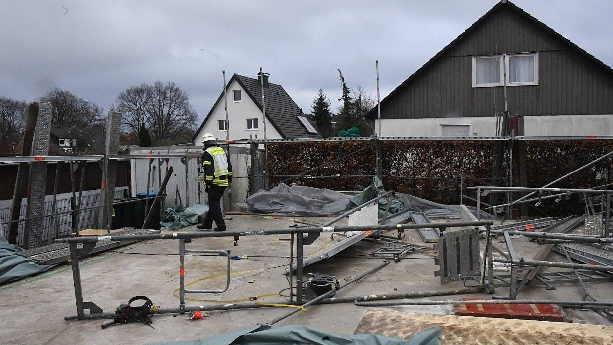 Als das Gerüst für das Haus an der Heinkelstraße aufgestellt werden sollte, erfasste vermutlich eine Windböe die Stahlelemente. | © Andreas Eickhoff