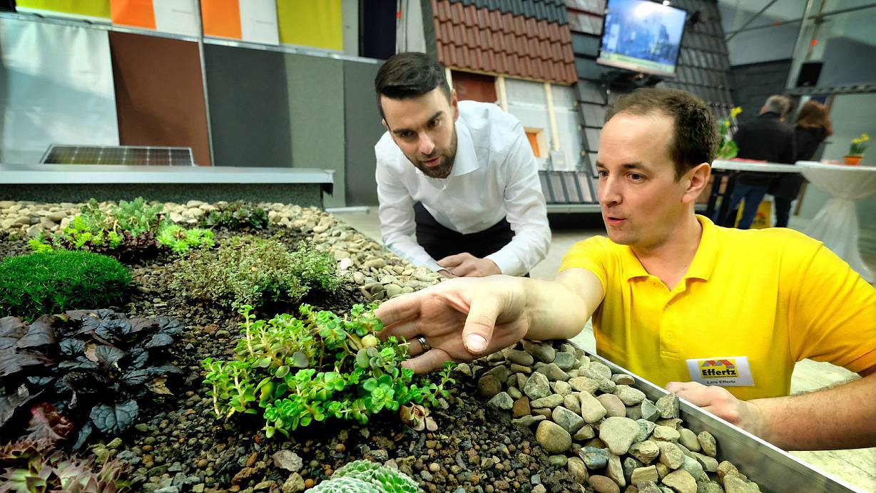 Flachdächer wie Bungalow oder Garage eigneten sich besonders gut für eine Dachbegrünung, weiß Knabe. Sedumpflanzen, die viel Hitze abkönnen, wie scharfer Mauerpfeffer oder Fetthenne, empföhlen sich für eine großflächige Begrünung. Auch die Pflege sei anspruchslos, einmal im Jahr würde reichen, erklärt Lars Effertz vom Unternehmen Ferdinand Effertz Bedachungen Gerüstbau GmbH aus Rheda-Wiedenbrück, das als einer von insgesamt mehr als 200 Ausstellern praktische Lösungen zur Dachbegrünung präsentiert.