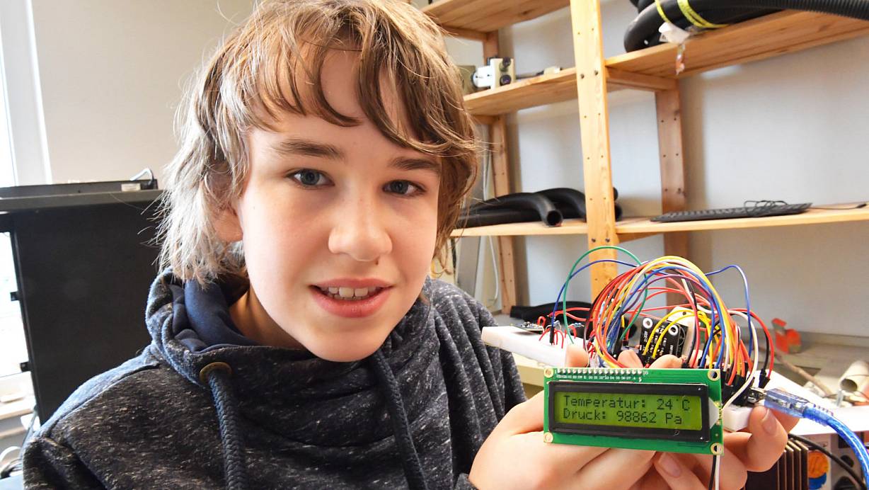 Gütersloh. Frösche auf Leitern haben in Zeiten mobiler Wettervorhersagen auf dem Smartphone seit Ewigkeiten ausgedient. Leider sind diese digitalen Prognosen aber nicht immer korrekt. Aus diesem Grund hat Simon Claas (12) von der Freien Waldorfschule in Friedrichsdorf eine wesentlich exaktere Methode entwickelt. Für einen Materialwert von nur 35 Euro hat der Siebtklässler in nicht einmal drei Monaten eine eigene Wetterstation programmiert und gebaut. Auf einem kleinen Display soll diese Temperatur, Luftfeuchtigkeit, Luftdruck, Regenwahrscheinlichkeit, Bodenfeuchtigkeit und Helligkeit anzeigen. Die Genauigkeit dabei? 100 Prozent.