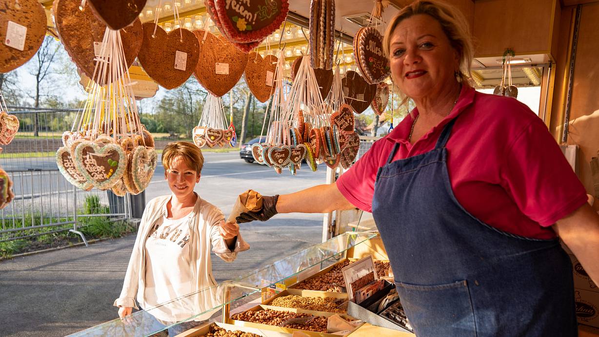 Lange musste Silke Palm auf frisch gebrannte Mandeln warten. Roswitha sorgt mit ordnungsgemäßem Abstand für ihr Kirmesvergnügen.  | © Christian Mathiesen