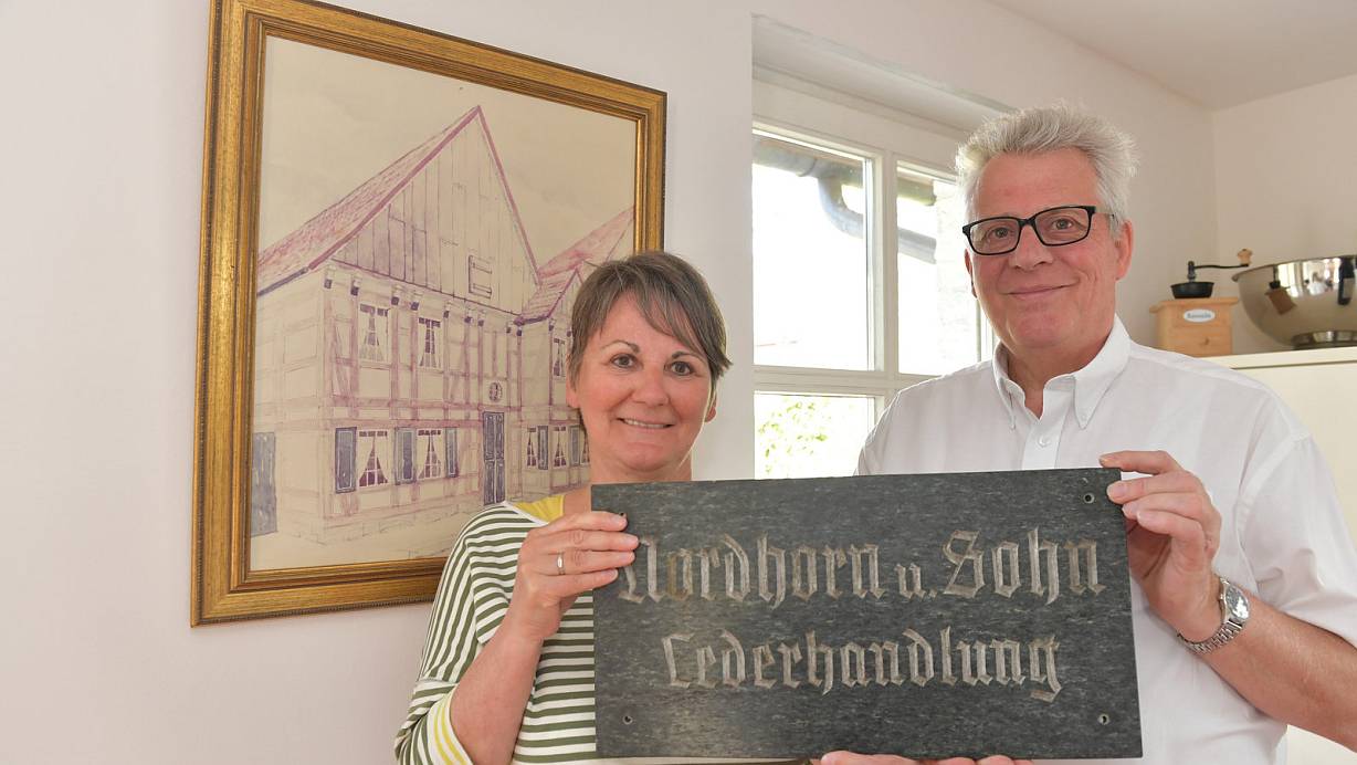 Andrea und Wilhelm Nordhorn halten das Firmenschild der 1910 von Wilhelms Großvater Franz gegründeten Lederhandlung. 1950 wurde der an der Königstraße ansässige Sitz (Bild im Hintergrund) der früheren Schäftemacherei nach Niehorst transloziert. Foto: Jens Dünhölter |