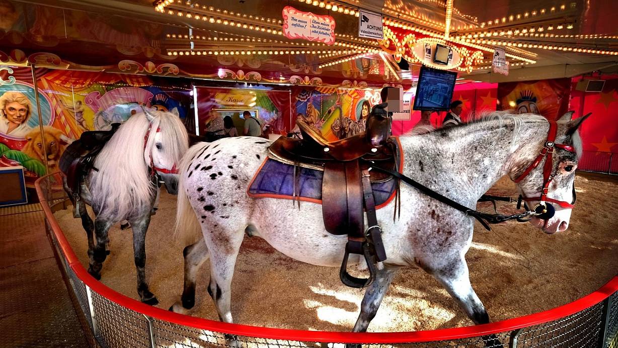 Der Verein „Achtung für Tiere" kritisierte den geringen Abstand zwischen den Pferden in Ponykarussells. Dieser könne unter Umständen zur Gefahr für den Menschen werden, wenn ein Tier nach hinten austritt. | © Andreas Frücht