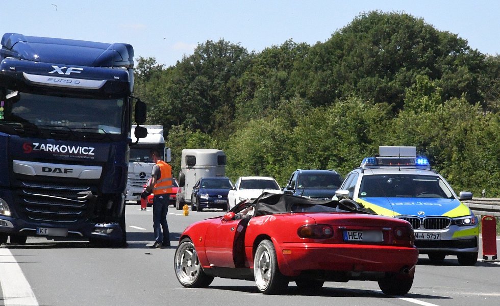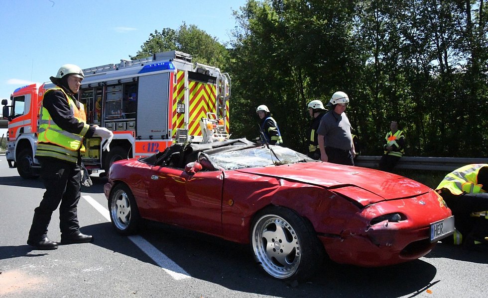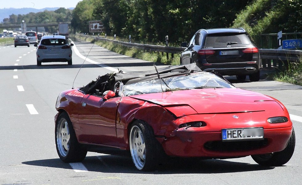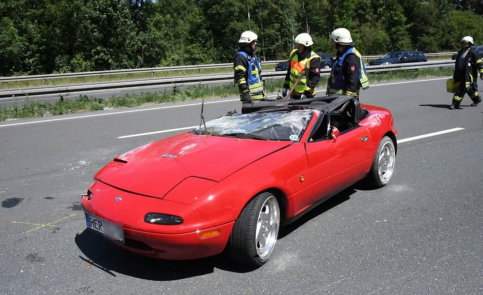 Als eine 64-jährige Autofahrerin aus Herne dem von hinten herannahenden Verkehr Platz machen und auf die mittlere Fahrspur der A2 in Fahrtrichtung Hannover wechseln wollte, verlor sie nach Polizeiangaben die Gewalt über ihren roten Mazda MX-5. Der Sportwagen überschlug sich daraufhin mehrmals und prallte noch gegen eine in Polen zugelassene DAF-Zugmaschine geprallt, dessen Fahrer auf der rechten Fahrspur unterwegs war.