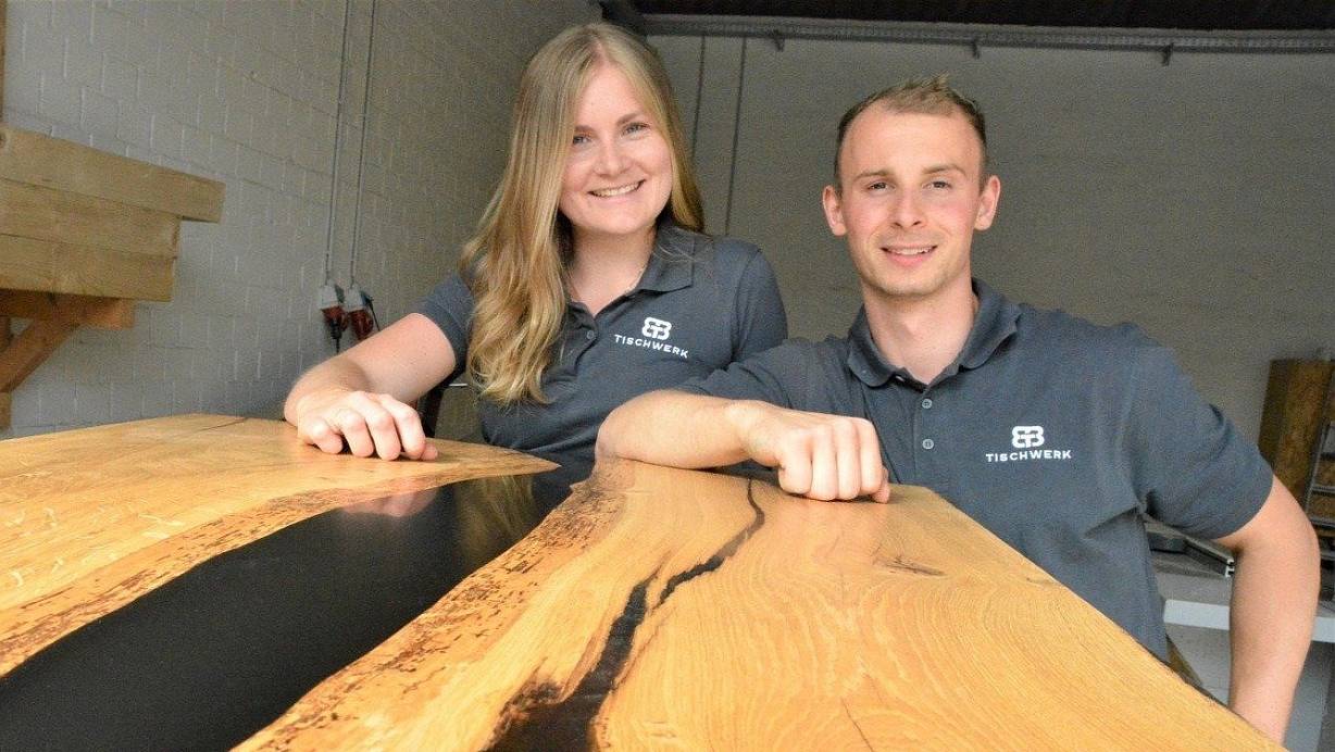 Das junge Start-up-Unternehmen von Dominik Becker und seine Freundin Tabea Düpree mit Namen BB-Tischwerk stellt massive Echtholz-Tischplatten in Kombination mit Epoxidharz her. | © Karin Prignitz