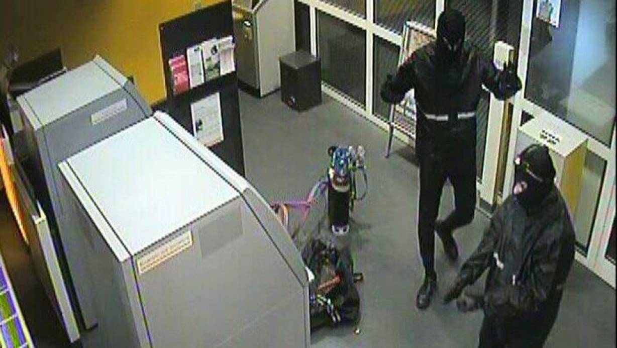 Zwei schwarz vermummte Gestalten bei der Arbeit. Sie versuchen, mit einem Gasgemisch den Automaten in die Luft zu sprengen, um an das Bargeld zu gelangen. | © LKA