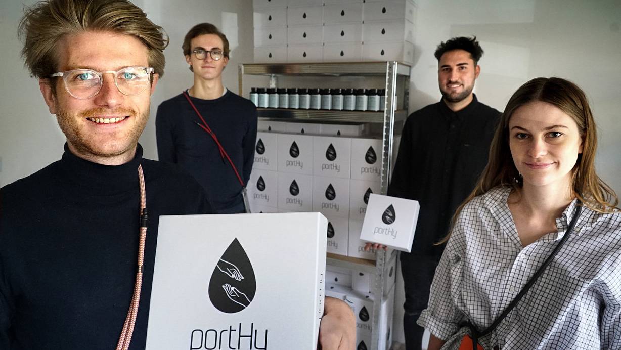 Jonathan Tenge (v. l.), Paul Böllhoff, Julian Hesse und Pauline Tenge haben etwa ein halbes Jahr lang an PortHy, einer Handykette mit integriertem Desinfektionsspender, gearbeitet. Mittlerweile ist der Vorverkauf gestartet. Obwohl Corona ein Ideengeber war, hat die Pandemie für das Start-Up nicht nur Vorteile. | © Christian Geisler