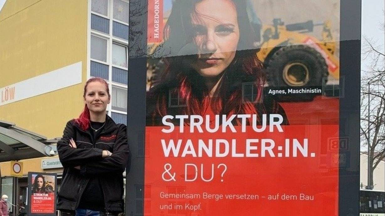 Die 26-jährige Agnes Borchers ist die einzige weibliche Maschinistin bei Hagedorn. Mit einer großen Plakat-Aktion will das Abbruchunternehmen jetzt weitere Frauen motivieren. bis Ende 2021 sollen mindestens drei weibliche Azubis eingestellt werden.