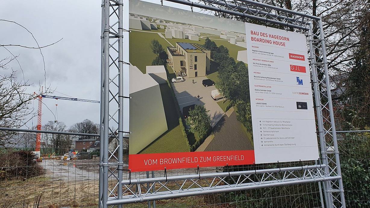 Auf dem Grundstück entsteht aktuell ein sogenanntes Boardinghouse. Auf der insgesamt rund 5.500 Quadratmeter großen Fläche am Sandbrink 16 soll nach Unternehmensangaben auf 970 Quadratmetern eine moderne Unterkunft errichtet werden, die privaten Wohnungen ähnelt, aber hotelähnliche Leistungen bietet. Von den Appartements profitieren sollen die Mitarbeiter von Hagedorn. Das Projekt liege genau im Zeitplan. Ende des Jahres soll der Bau fertig sein. Ob noch weitere solcher Projekte entstehen, hänge davon ab, welche Erfahrungen das Unternehmen in den ersten ein bis zwei Betriebsjahren mache. Zum Beispiel was den Bestandsaufwand angehe sowie das Feedback der Mitarbeiter. Einschränkungen auf dem Bau gebe es durch die Corona-Krise nicht.
