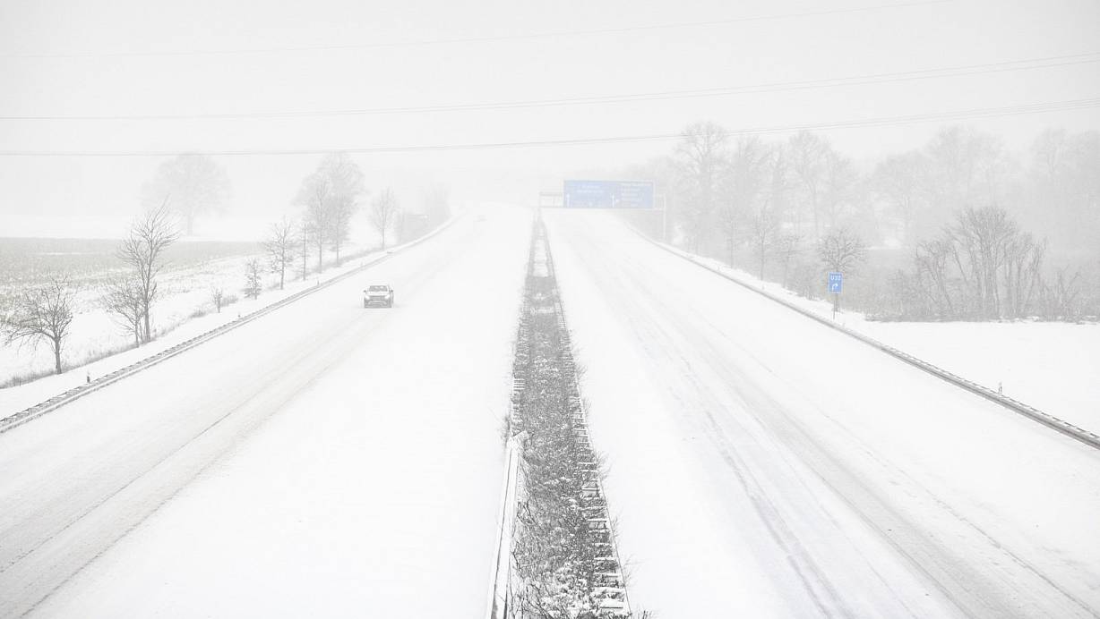 Ein Auto fährt über die völlig zugeschneite Autobahn 2 am Sonntag bei Rheda-Wiedenbrück. | © picture alliance/dpa