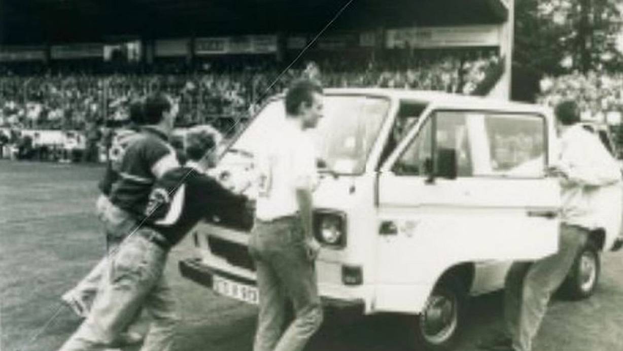 Am 23. September 1989 schieben Fußballer des VfB Stuttgart und Ordnungskräfte im Gütersloher Heidewald den VW Bulli von Gustav Vornbäumen vom Spielfeld. Der Ballonfahrer war in die Luft aufgestiegen, hatte aber die Schlüssel seines Fahrzeugs in der Hosentasche vergessen. | © Raimund Vornbäumen
