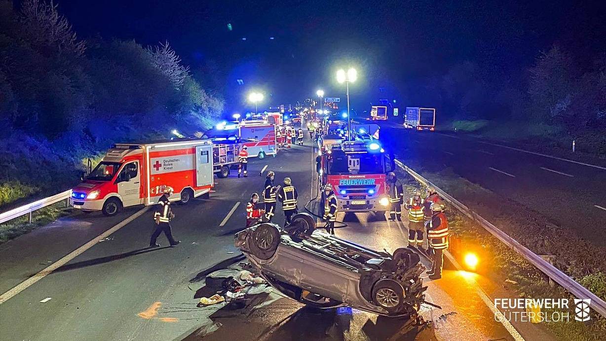 Durch den Unfall wurden der 34-jährige Mann aus Ennepetal und der 80-jährige Potsdamer verletzt und mit Rettungsfahrzeugen der Feuerwehr in umliegende Krankenhäuser gebracht. Nach Polizeiangaben wurden die Betroffenen offenbar aber nicht lebensbedrohlich verletzt. Die drei beteiligten Wagen wurden abgeschleppt. Die Richtungsfahrbahn Dortmund und die Anschlussstelle Gütersloh mussten für die Dauer der Unfallaufnahme und Bergungsarbeiten bis ca. 23 Uhr komplett gesperrt werden. Der Verkehr staute sich zeitweise auf eine Länge von fünf Kilometer. Es entstand hoher Sachschaden.