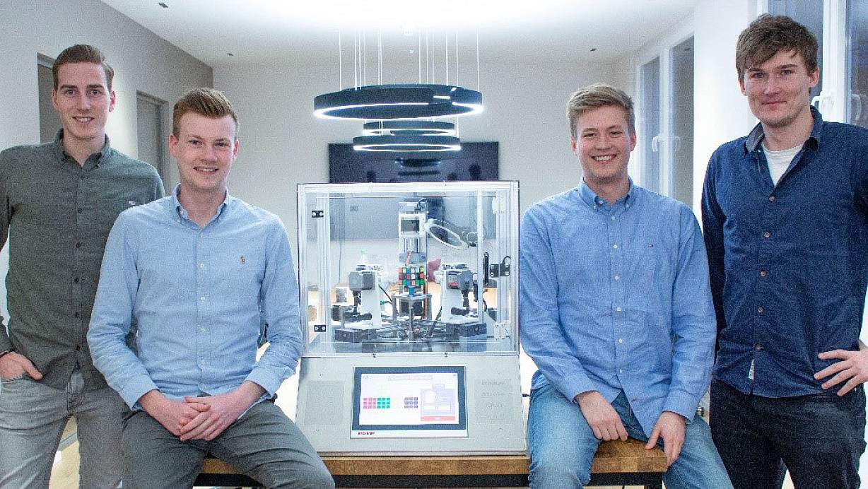 Matthias Risse, Laurids Wetzel, Tom Töws und Jan Ewerszumrode hatten sich für den Bau einer „Zauberwürfellösemaschine” entschieden. Projektleiter Tom Töws: „Fast die gesamte Konstruktion haben wir selbst entwickelt. Während der Konstruktionsphase haben wir uns Gedanken über die einzelnen Komponenten gemacht, sodass wir dies sehr detailliert in der Zeichnung berücksichtigen konnten." Im nächsten Schritt ließ das Team einige Elemente vom Kooperationsunternehmen Miele anfertigen. Andere, zum Beispiel die Würfelanbindungen und die Motorhalterung, wurden selbst über einen 3D-Drucker produziert.