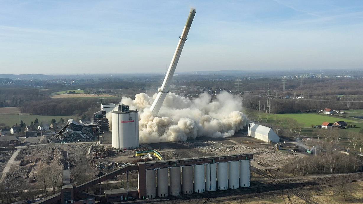 Castrop-Rauxel 2019: Der Schornstein des ehemaligen Kraftwerks Knepper fällt nach einer Sprengung zusammen. Die Abbruchfirma Hagedorn hatte das 2014 stillgelegte Kraftwerk 2017 von Uniper und Eon gekauft. | © picture alliance/dpa