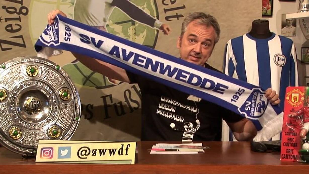 Das Retro-Shirt von Arminia Bielefeld in den Hintergrund gedrängt: Der Fanschal des SV Avenwedde ist am Sonntag in der Fernseh-Kultshow „Arnd Zeiglers wunderbare Welt des Fußballs" bei einem Beitrag über Dirk van der Ven ganz groß rausgekommen. Der Moderator küsste sogar das Wappen und legte den Schal auf die Meisterschale. | © WDR