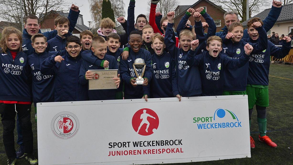 Nun hat sich der FCG zurückgemeldet, und das sogar mit einem Titel. In dem spannenden D-Junioren-Finale mit Verlängerung und Entscheidungsschießen siegten die Heidewald-Jungs mit 6:3 (2:1, 2:2) gegen den SC Wiedenbrück. „Für unsere Jugendabteilung ist das ein historisches Ereignis", freute sich Vorstandsmitglied Helmut Delker. Der Pokalgewinn war auch ein Verdienst von Antonius „Tony" zu Schwabedissen. Der eingewechselte Keeper parierte zwei Neunmeter.