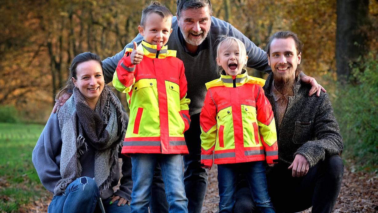 Thilo (6) und Amelie (4) sind begeistert von den bunten Jacken. Mutter Tatjana Diekmannshemke (33) (l.), Großvater Claas-Gerrit Niemöller (60) (hinten) und Onkel Gerrit Friedrich-Niemöller (31) (r.) wollen, dass Kinder auch in der dunklen Jahreszeit gesehen werden. | © Andreas Frücht