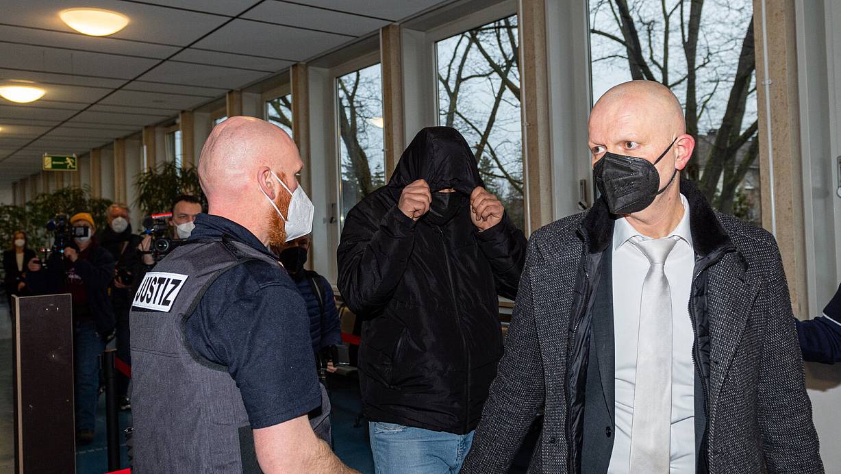 Der Angeklagte (M) im Prozess um den Unfalltod des serbischen Sängers Saban Saulic, kommt mit seinem Anwalt Jerrit Schöll in den Sitzungssaal des Amtsgerichts in Gütersloh. | © picture alliance/dpa
