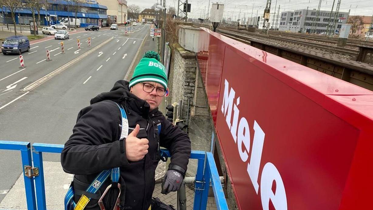 Der erste Miele-Schriftzug wurde am Dienstagmittag fertiggestellt. | © Christian Bröder