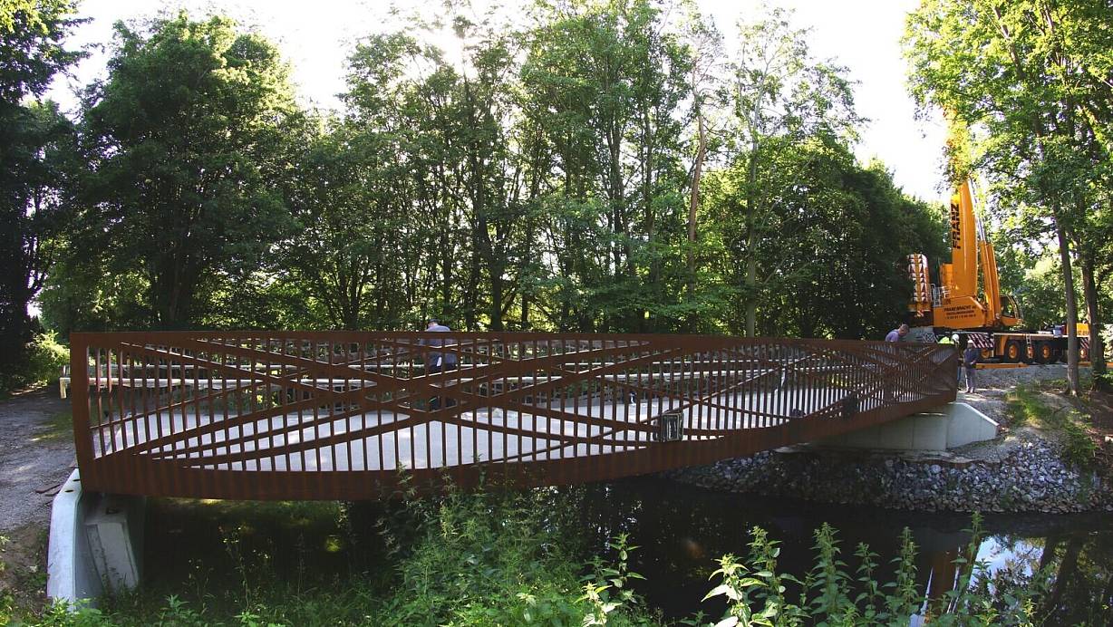 Die „kleine Brücke“ hat das gleiche Design wie das große Vorbild und besteht aus Corten-Stahl. Wie die „große Schwester“ wurde sie in Stemwede (Kreis Minden-Lübbecke) im Unternehmen Rohlfing hergestellt. Angeliefert wurde sie in den frühen Morgenstunden von einem Transporter, ein siebenachsiger Kran hat sie dann über die alten Bäume gehoben und an ihrem Standort abgesenkt. Dort liegt sie momentan noch auf Holzklötzen auf, bevor sie in den nächsten Tagen millimetergenau auf ihren zukünftigen Platz abgesenkt wird.