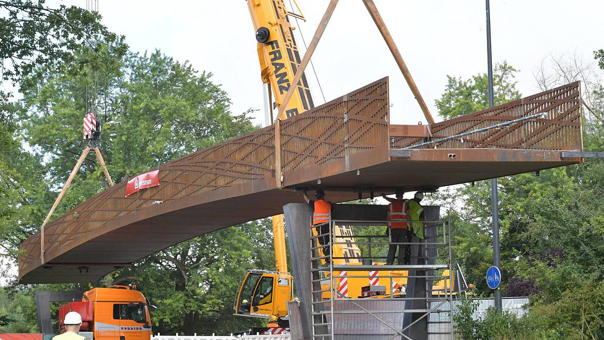 Beim Einheben des Mittelteils der neuen Brücke über den Westring war am Samstag Millimeterarbeit gefragt. | © Jens Dünhölter