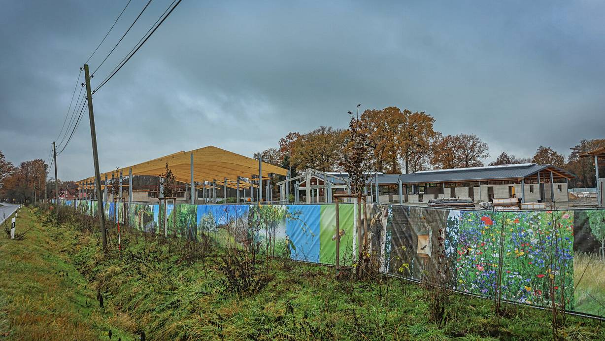 Hinter dem bunten Bauzaun mit Naturbildern schlummert die Baustelle der geplanten SL Riding Ranch. Ob der generelle Baustopp bestehen bleibt oder aufgehoben wird, darüber entscheiden die Richter am Verwaltungsgericht Minden. | © Sarah Jonek