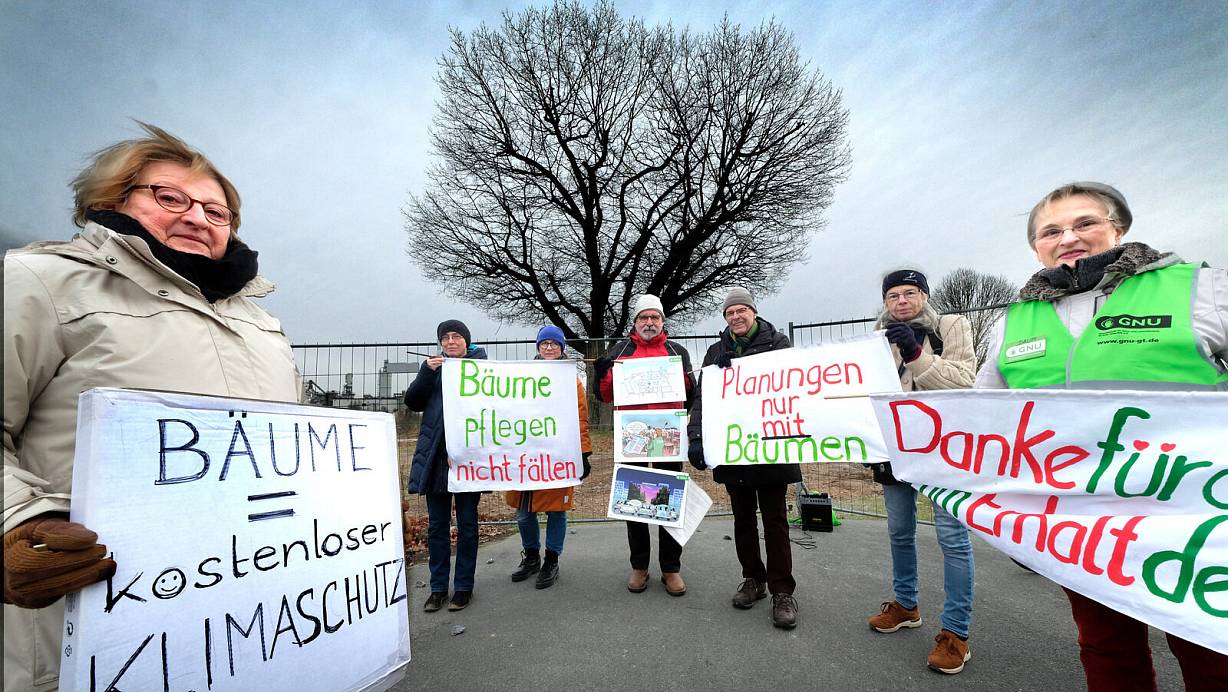 Umweltschützer versammeln sich zu einer Demonstration auf dem alten B+R-Gelände. Derweil hat an den Grundschulen das Fällen für den Schulausbau begonnen.