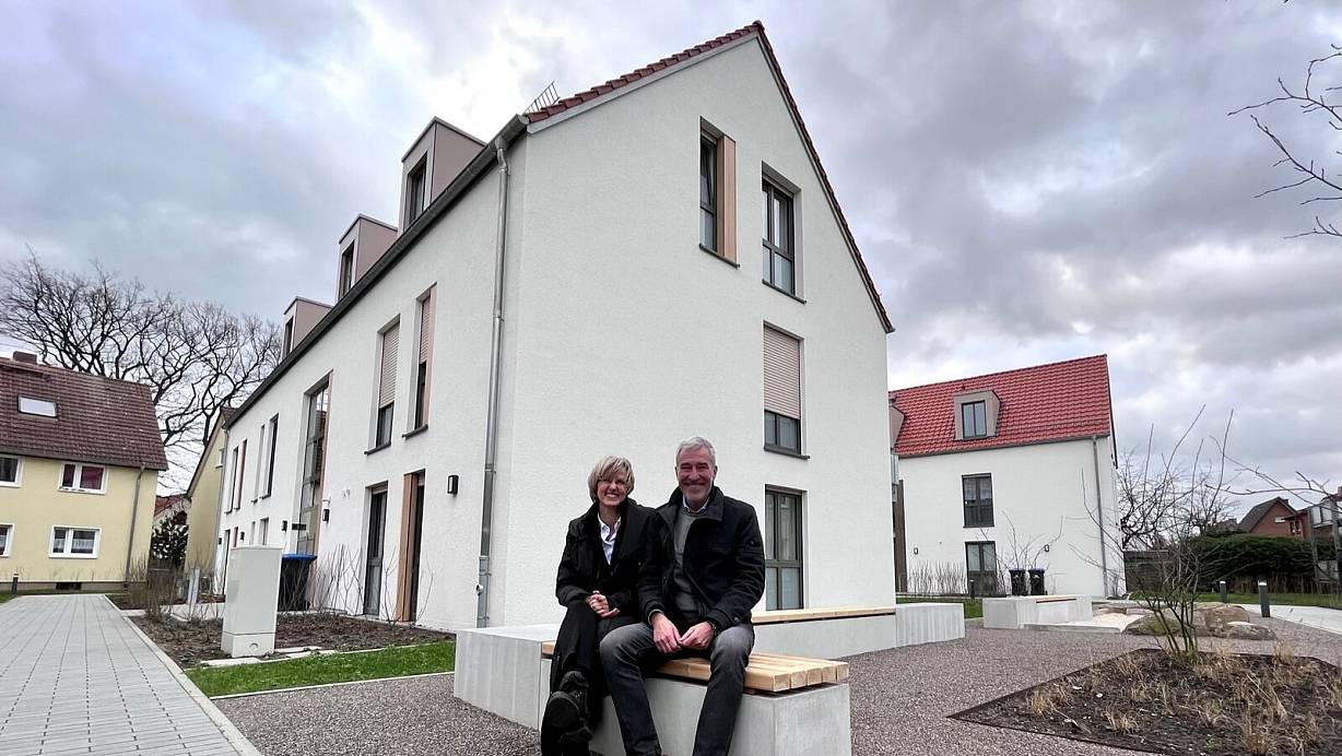 Architektin Birgit Melisch und Bauverein-Vorstandsvorsitzender Jörg Höfel präsentieren die drei Neubauten mit insgesamt 22 Wohnungen an der Holzrichterstraße. | © Robert Becker