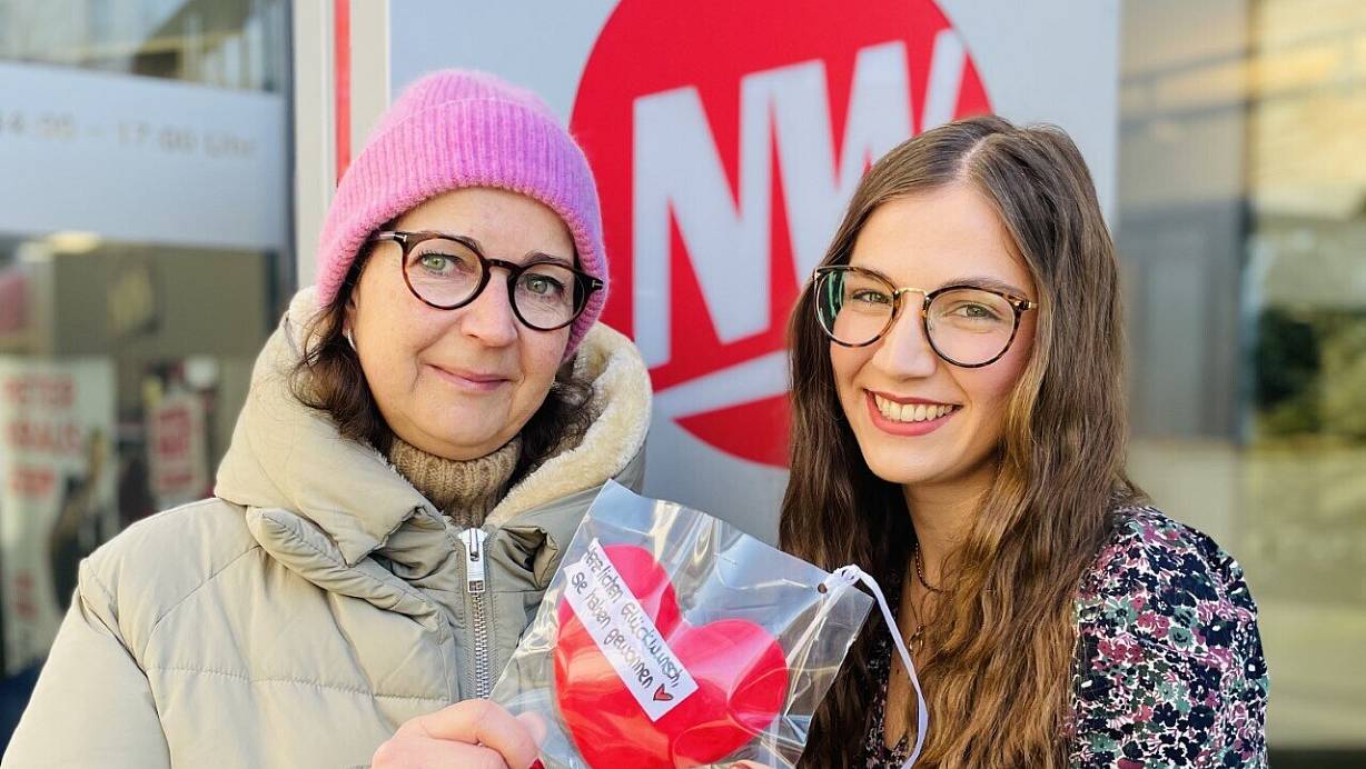 Die Gütersloherin Susanne Zimmermann (l.) hat das rote Herz am Dienstagmorgen im Stadtpark gefunden und in die Lokalredaktion zu NW-Redakteurin Lena Vanessa Niewald gebracht. | © Max Maschmann