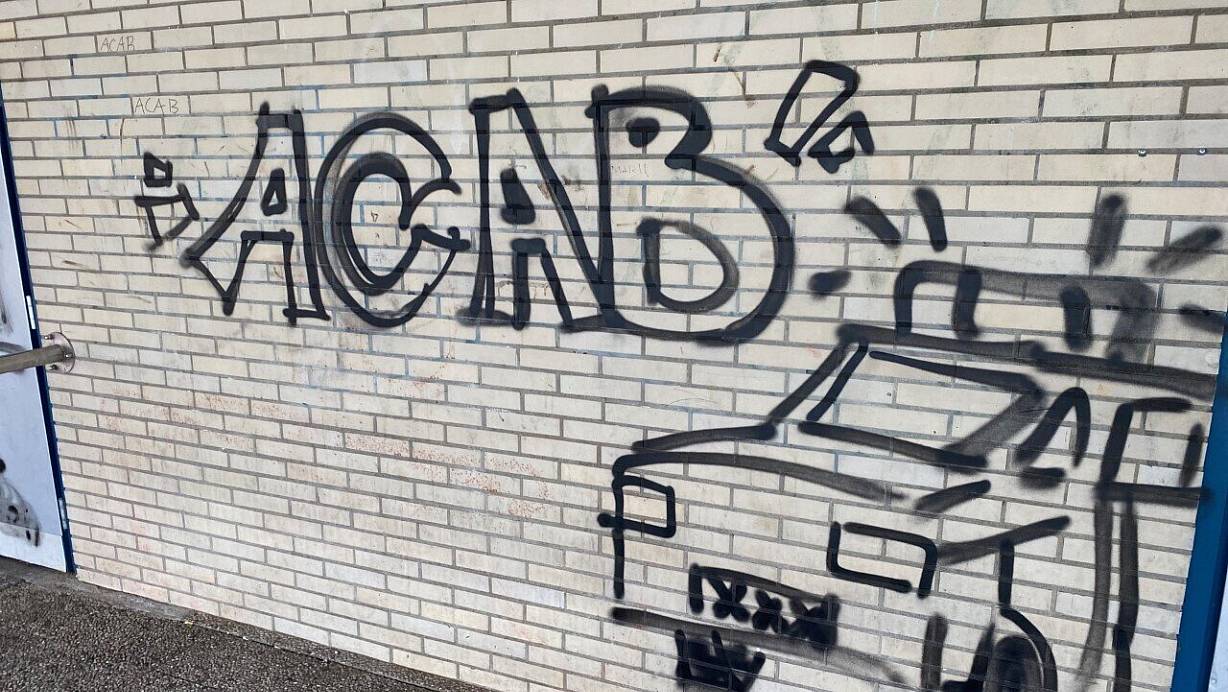 Mit Edding aufgemalte Hakenkreuze und den Schriftzug "ACAB" (All cops are basterds) haben unbekannte Täter an die Fassade der städtischen Realschule in Gütersloh geschmiert. | © Christian Bröder