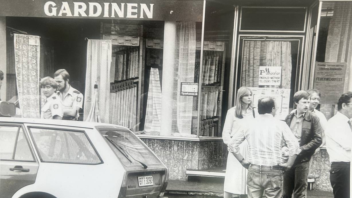 13. August 1981: Helle Aufregung am Tatort und vor dem Gardinenfachgeschäft an der Isselhorster Straße in Avenwedde. Kriminalpolizisten beginnen mit ihren Ermittlungen, Schaulustige beobachten das Geschehen. Fotos: Wolfgang Wotke | © Wolfgang Wotke