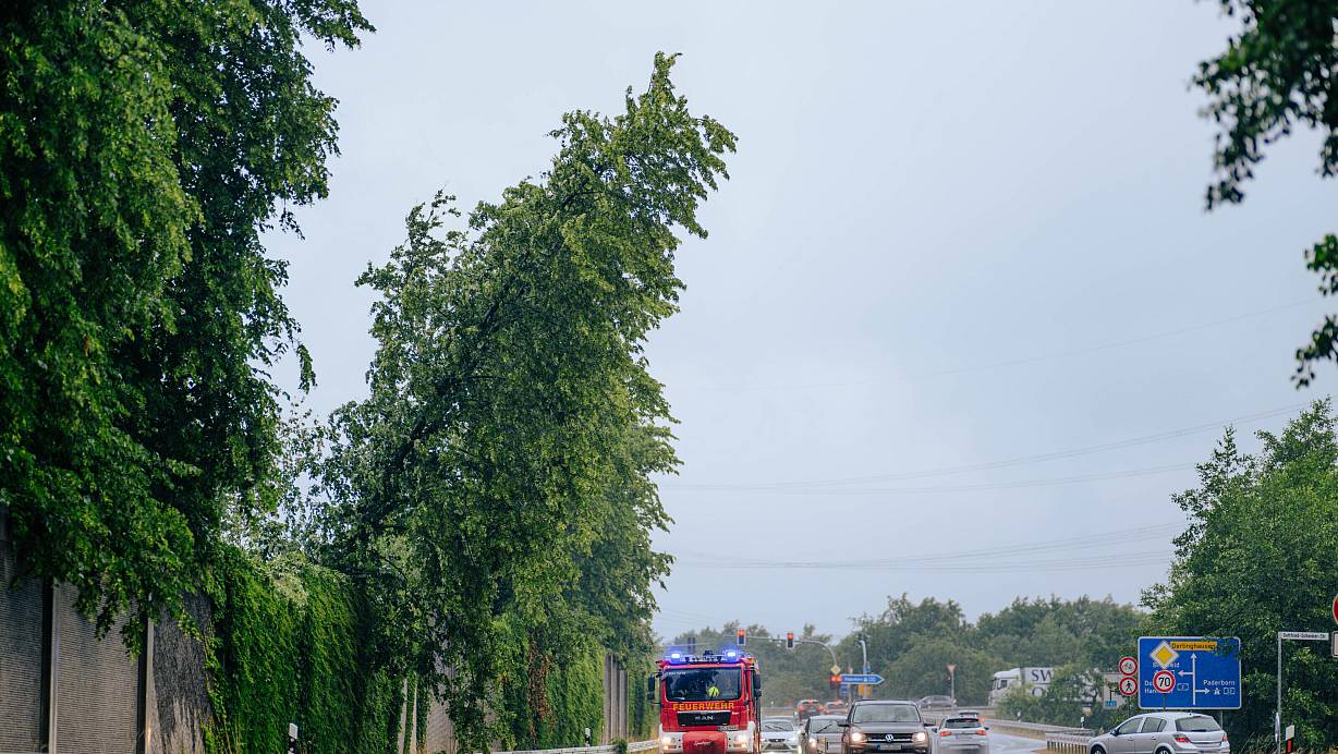Während des Unwetters "Lambert" drohte ein Baum an der Autobahnzufahrt in Schloß Holte-Stukenbrock auf die Straße zu kippen. Die Feuerwehr sicherte den Bereich und fällte den Baum. | © BESIM MAZHIQI