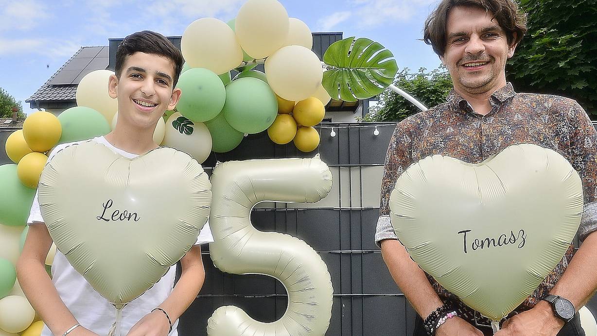 Der heute 15 Jahre alte Leon Somiy aus Gütersloh und Spender Tomasz Jaworski mit der Jahreszahl der erfolgreichen Stammzellenübertragung. | © Uwe Caspar