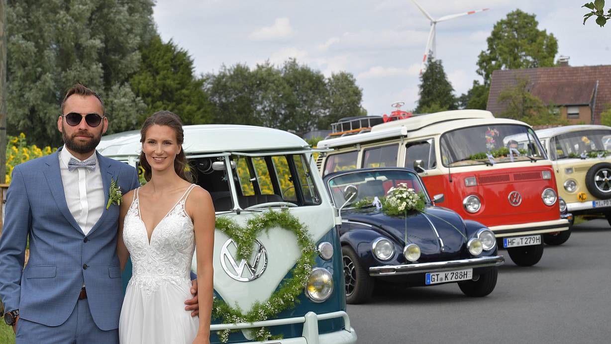 Nachdem sich Alicia Horta da Silva und Marcel Koch das Jawort gegeben hatten, wurden sie von einem Konvoi historischer Volkswagen durch Friedrichsdorf begleitet.