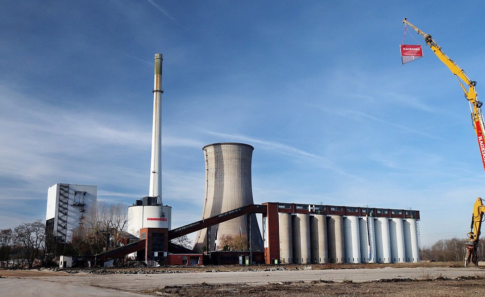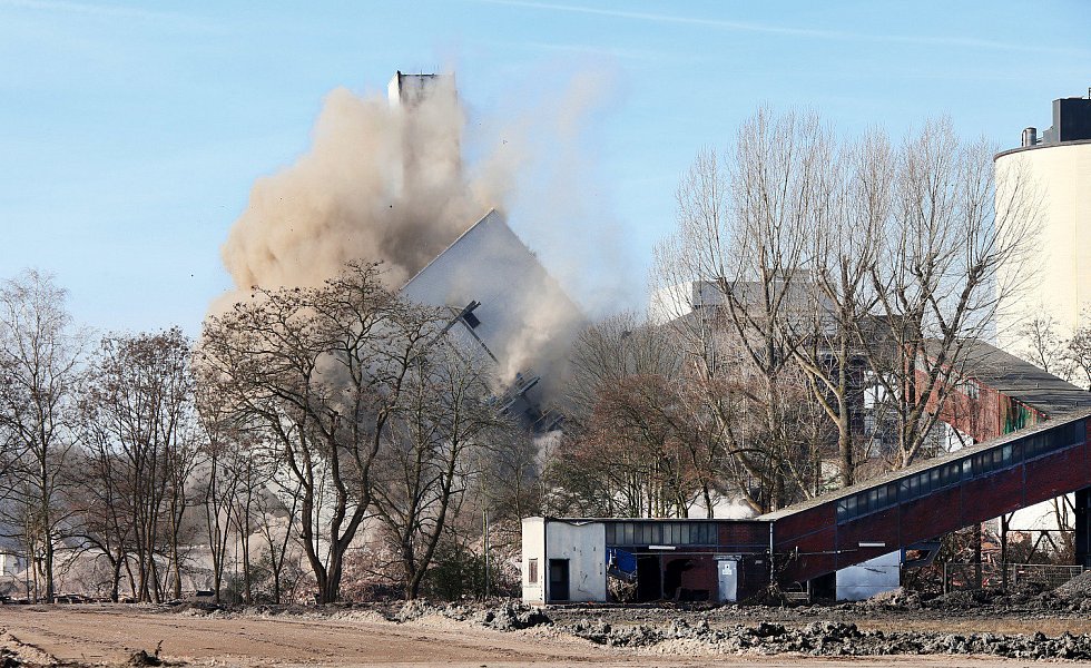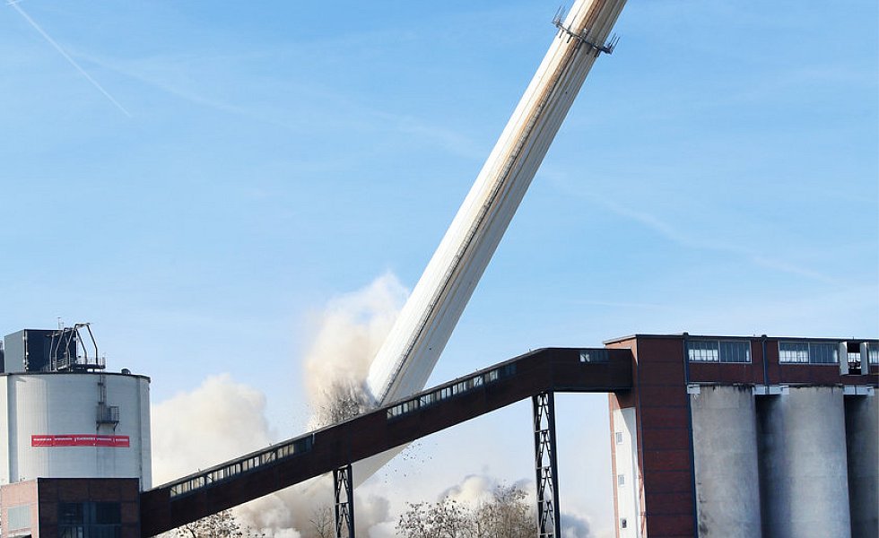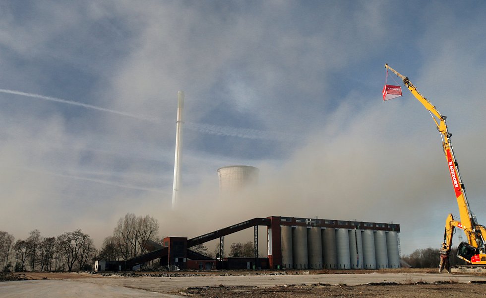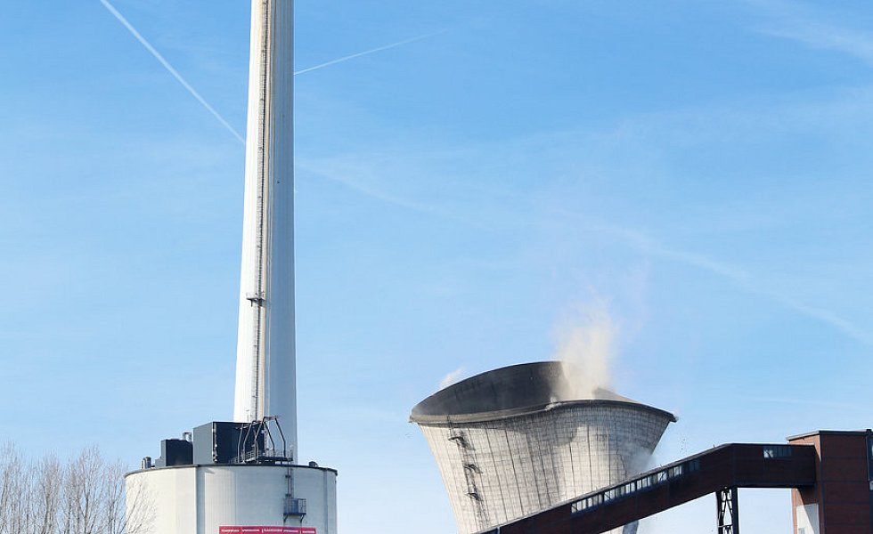 Kühlturm, Kesselhaus und Schornstein zu Fall gebracht