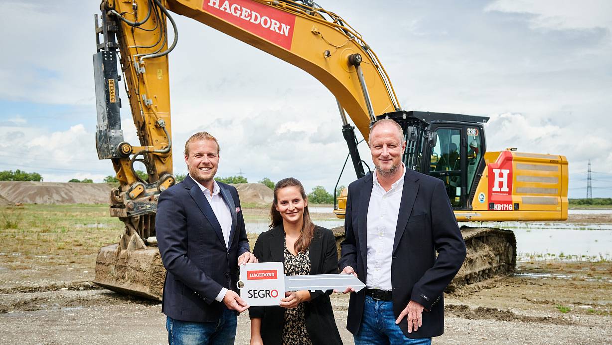 Das Referenzprojekt für die von der Bundesregierung angestrebte nachhaltige Baulandentwicklung geht jetzt nach langen Verhandlungen in die nächste Phase: SEGRO hat die ersten Bauanträge eingereicht und will in Kürze mit dem Hochbau beginnen. Um die baureife Fläche offiziell zu übergeben, trafen sich Hagedorn und SEGRO zur symbolischen Schlüsselübergabe.