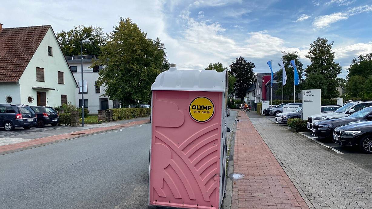 Ein rosafarbenes Toiletten-Häuschen auf der Kahlertstraße sorgt für verwunderte Blick in Gütersloh. Seit ein paar Tagen steht es dort einsam und verlassen. Was dahinter steckt.