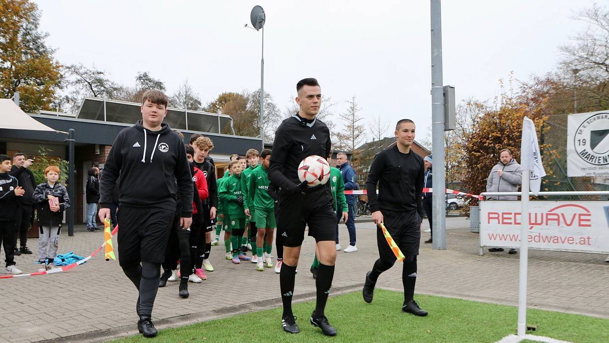 Marienfeld. Das Ergebnis von 0:11 war eher nachrangig beim zweiten Meisterschaftsspiel der C1-Hauptrunde am Samstag, das regnerische Novemberwetter auch. Im Zentrum stand bei dem Lokalderby zwischen Schwarzweiß Marienfeld und FC Gütersloh der Unparteiische. Um den 21-jährigen Pascal Martin alias „Quallexd001“ live und in Farbe zu sehen waren die meisten der vielen Besucher zum Sportzentrum Ruggebusch gekommen.