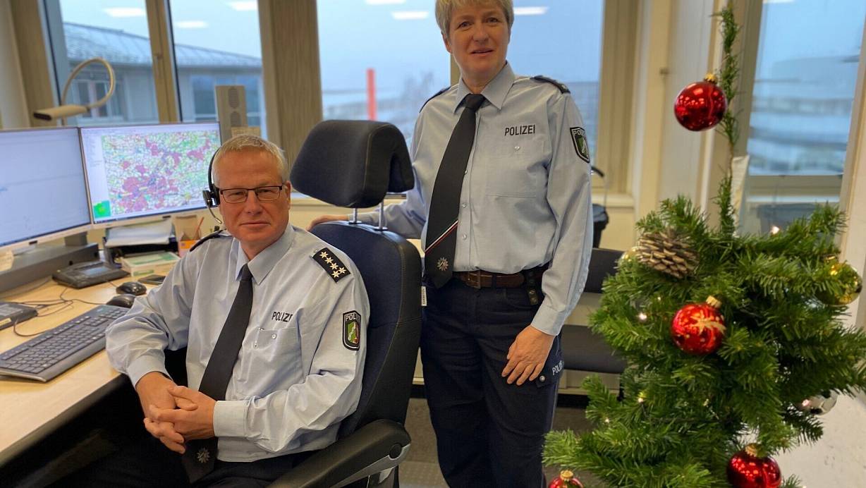 Wachdienst statt Weihnachtsbraten: Die Gütersloher Polizisten Klaus Bardowieck und Katrin Stellbrink übernehmen in diesem Jahr an Heiligabend die Schicht im Spätdienst. Auch auf der Leitstelle herrscht an Heiligabend eine besondere Stimmung. | © Christian Bröder