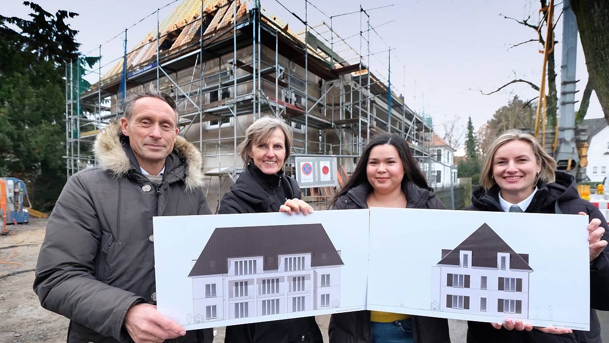 Immobilienunternehmer Peter Oesterhelweg (v.l.), Architektin Birgit Melisch, Arcihitektin Michael Lo, Maklerin Anne Jasper. Links die Ansicht Kurfürstenstraße, rechts Bismarckstraße. | © Andreas Frücht