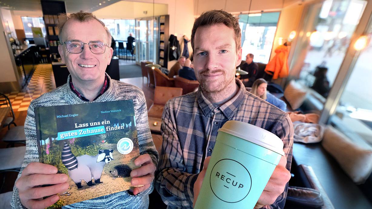 Der Gütersloher Niklas Lukarsch (rechts) bietet in seinem Café am Kolbeplatz Pfand-Mehrwegbecher für den Kaffee zum Mitnehmen an. Auf Einwegbecher nimmt er 20 Cent Aufschlag. | © Andreas Frücht
