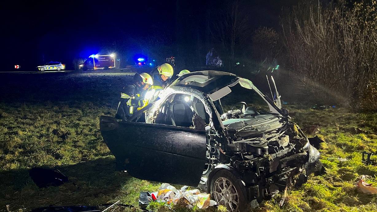 Nachdem er zuerst ein Verkehrsschild überfahren hatte, geriet der Smart dann auf eine Ackerfläche, überschlug sich dort mehrfach und kam nach etwa 50 Meter zum Stillstand. Dabei hinterließ das Fahrzeug eine lange Trümmerspur.