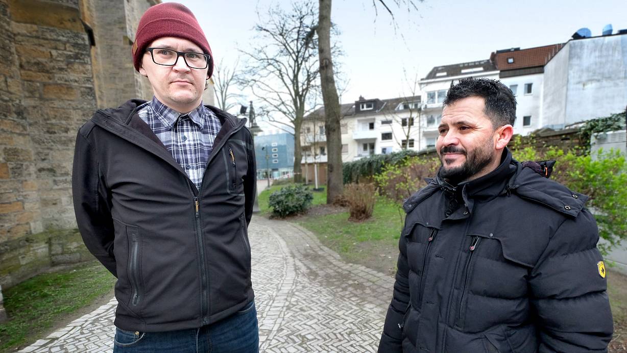 Zurück am Ort des Geschehens: Der Iraker Ismail Haji (rechts) und der Russe Kirill Loginov haben am Donnerstag einen Handtaschenraub in der Gütersloher Innenstadt vereitelt. Die Täter konnten über den Fußweg neben der Martin-Luther-Kirche fliehen. | © Andreas Frücht