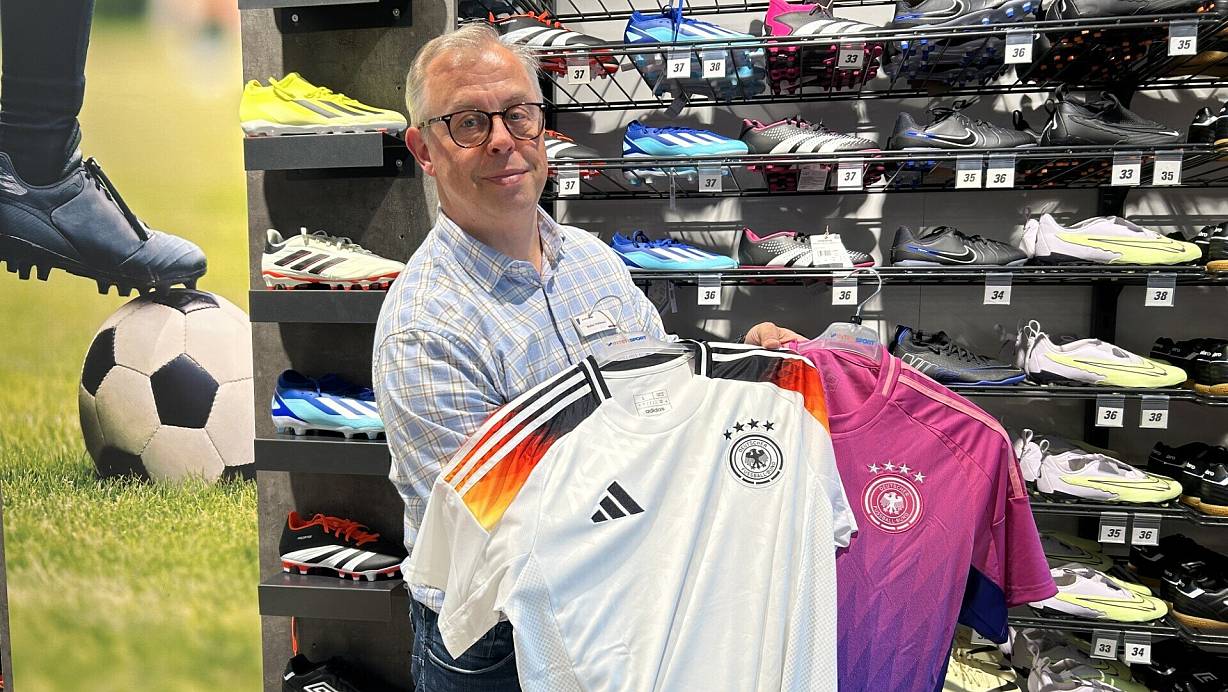 Gefragt sind bei Intersport Finke am Gütersloher Kolbeplatz vor allem die lila-pinken Auswärtstrikots der DFB-Elf, berichtet Mitarbeiter Stefan Heitmann. | © Max Maschmann
