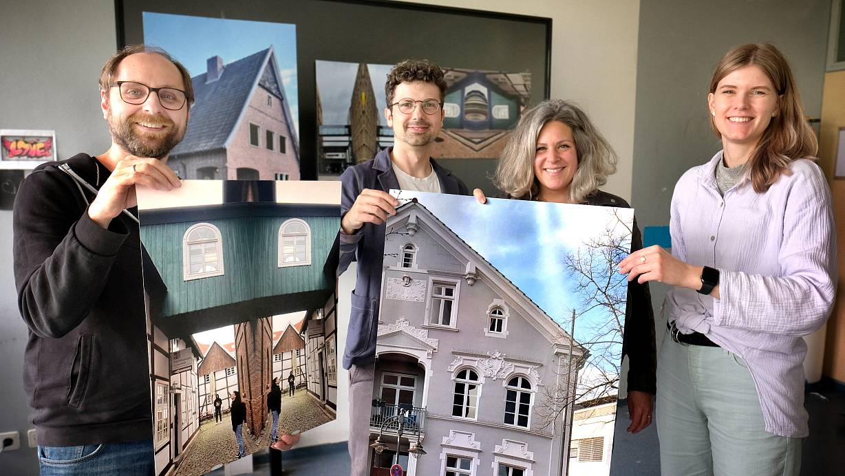 Freuen sich, dass ihr Unterricht preisverdächtig ist: (v.l.) der stellvertretende Schulleiter der JKG Christoph Steibelmüller und die Kunstlehrenden Lenny Liebig, Laura Berressem und Annika Stuckmann mit Arbeiten ihrer Schüler. | © Andreas Frücht
