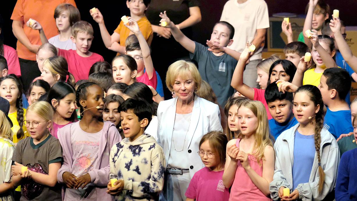 Bei der dritten Aufführung war auch Stifterin Liz Mohn in Begleitung ihrer Tochter Brigitte anwesend. Und am Ende nicht weniger begeistert als die knapp 500 Grundschulkinder im Saal, die das Stück mit tosendem Geschrei und Beifall feierten.