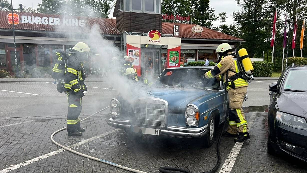 Darüber hinaus streute die Feuerwehr die Kraftstoffspur ab, die der Mercedes aus dem Jahr 1972 hinter sich her zog. Das im Motorraum und durch den Rauch auch im Innenraum schwer in Mitleidenschaft gezogene Fahrzeug musste abschließend abgeschleppt werden. Der Besitzer des Oldtimers hat das Fahrzeug gerade erst für 14.000 aufarbeiten lassen.