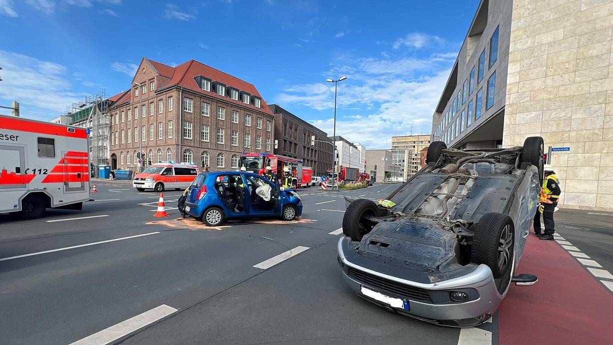 Aus Richtung Verler Straße kommend war zu der Zeit eine 29-jährige mit ihrem Hyundai Kleinwagen auf der Friedrich-Ebert-Straße unterwegs. Auf der Kreuzung kam es zum Zusammenstoß der beiden Fahrzeuge.Die Wucht des Aufpralls war so stark, dass der Touran des 48-Jährigen aufs Dach gestürzt ist. Über Notruf wurde zunächst gemeldet, dass noch Personen im Fahrzeug eingeklemmt sind. Daraufhin wurden die Berufsfeuerwehr und der Löschzug Gütersloh, sowie drei Rettungswagen und ein Notarzt alarmiert.