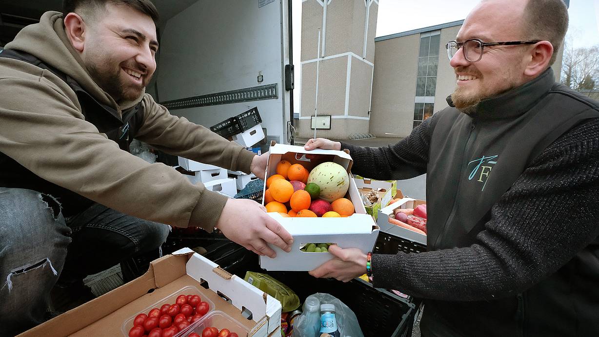Mahsum Kara (l.) und William Welk aus Bielefeld verkaufen jede Wochen an der Brunder-Konrad-Kirche in Gütersloh gerettete Lebensmittel. | © Andreas Frücht