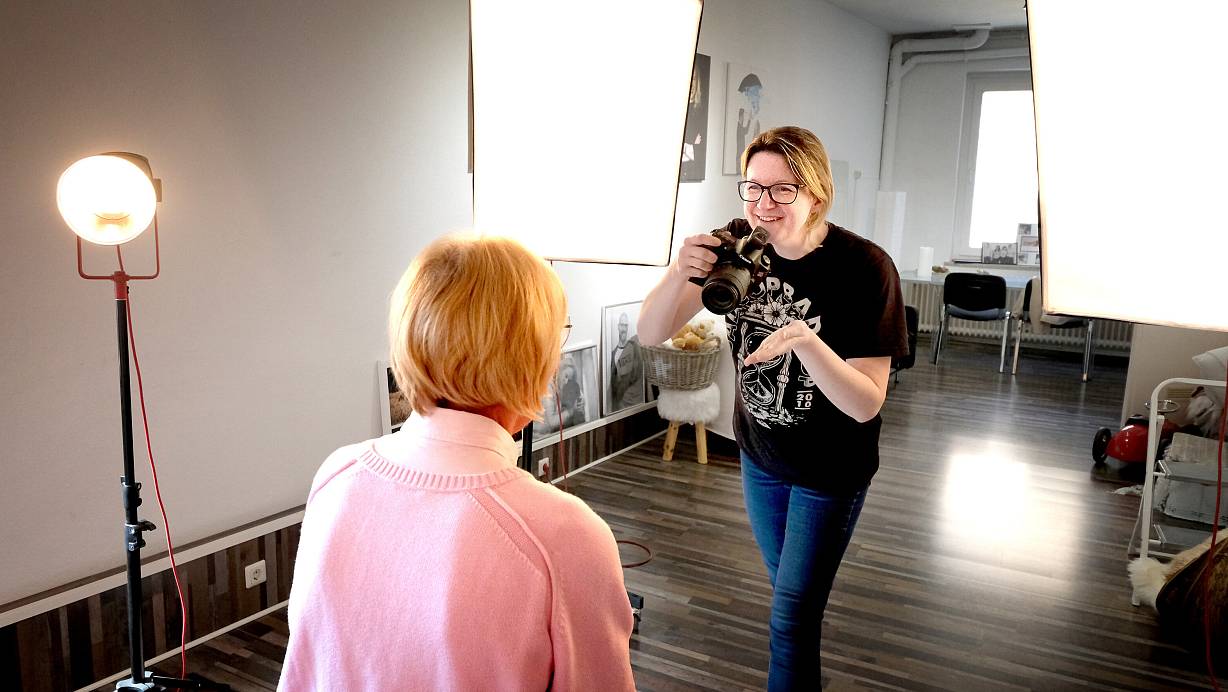 Gut ausgeleuchtet: Fotografin Catharina Schorcht demonstriert als Alternative zum Ausweisfotografen die entspannte Atmosphäre des Fotostudios. | © Andreas Frücht