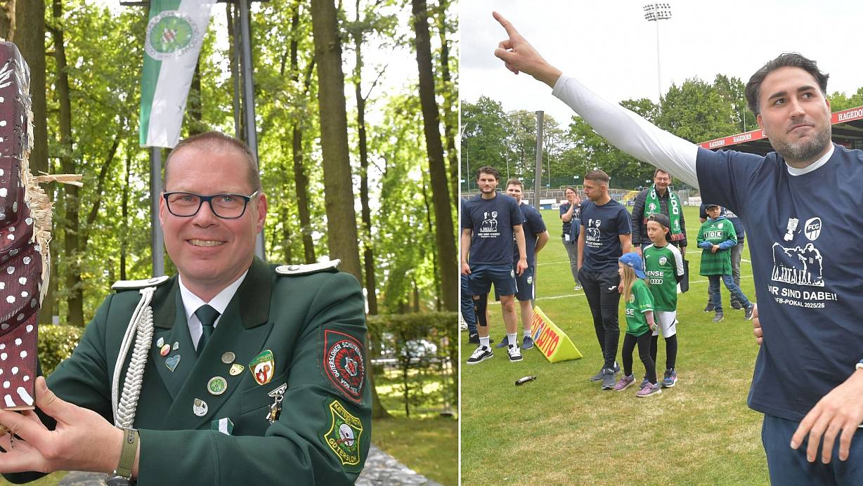 Andreas Reketat (l.), amtierender König der Stadtschützen, und Julian Hesse, Trainer des FC Gütersloh, wollen beide Mitte August ihre Events im Gütersloher Heidewald ausrichten | © Jens Dünhölter